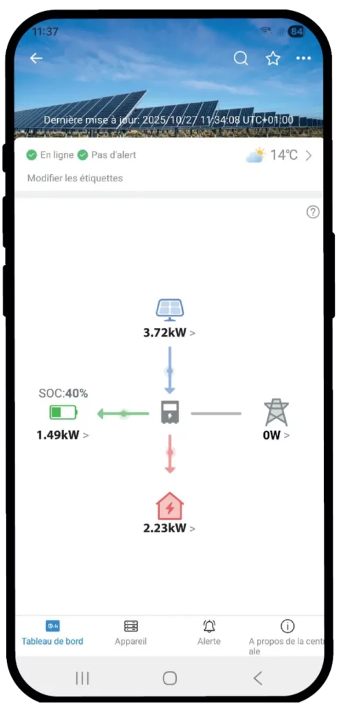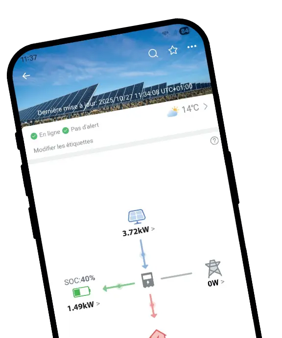 Grâce à l’application Solarman Smart, vous visualisez votre production solaire, l’état de charge de la batterie et votre consommation.